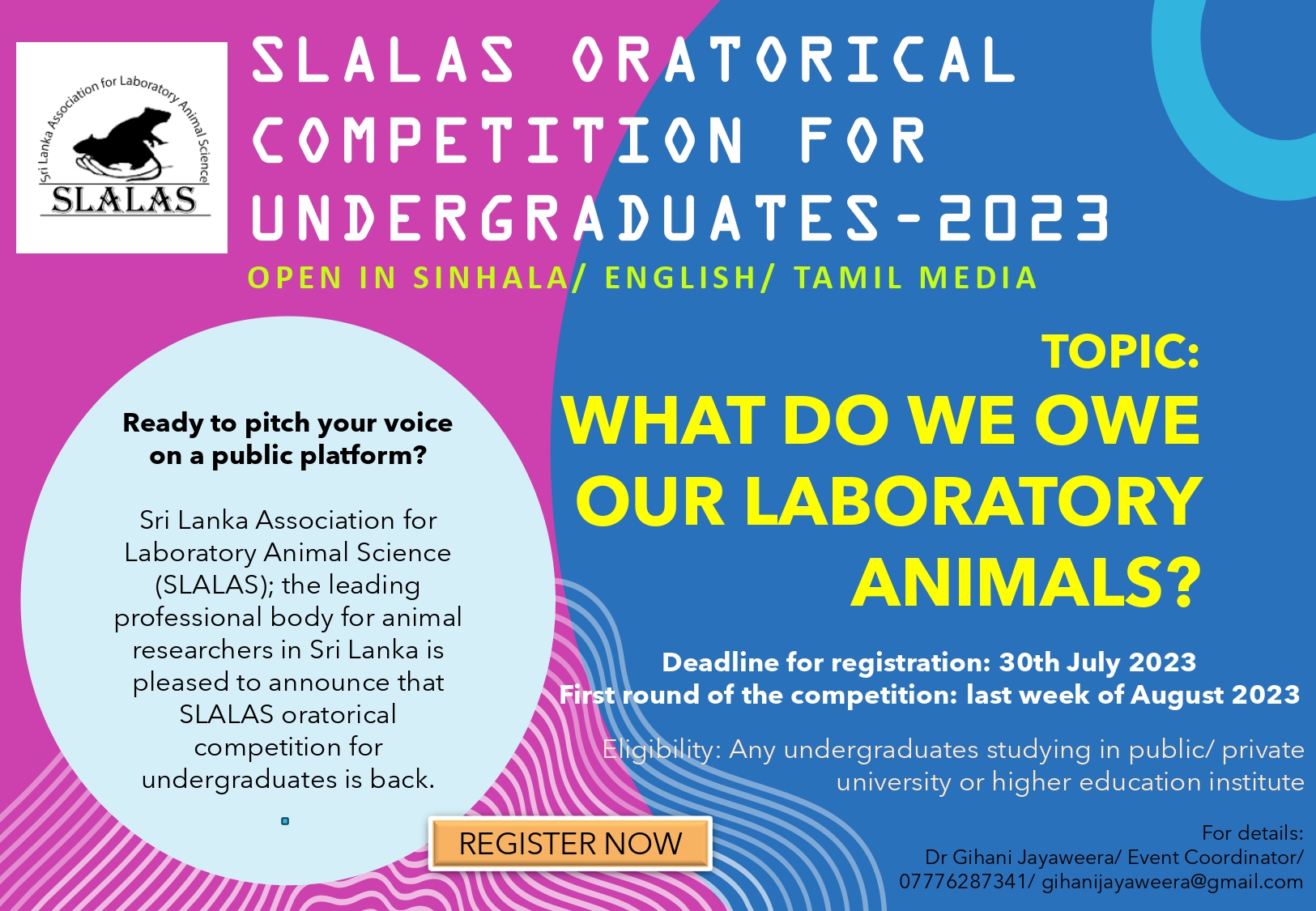 Sri Lanka Association for Laboratory Animal Science (SLALAS); the leading professional body for animal researchers in Sri Lanka is pleased to announce that SLALAS oratorical competition for undergraduates is back.